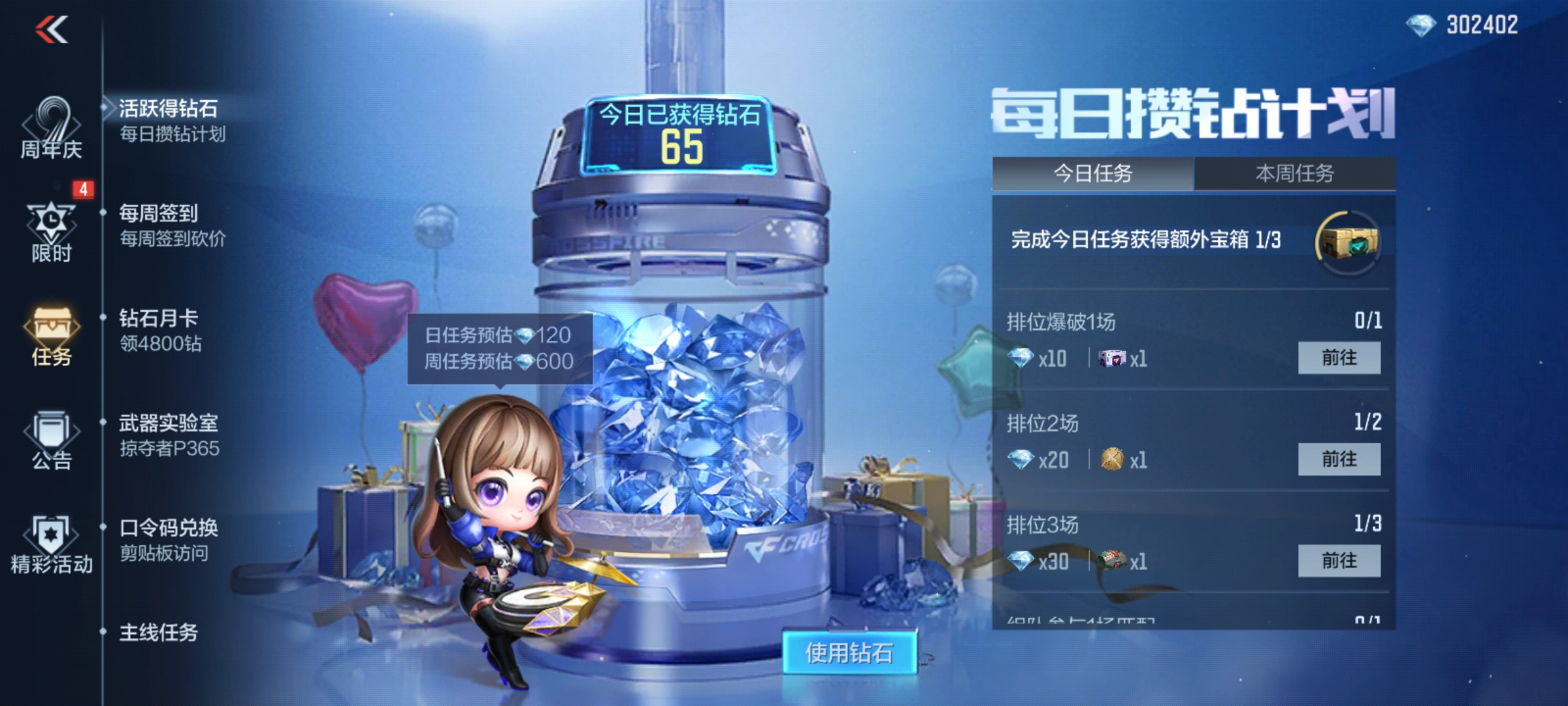 同时每日攒钻计划里也会有钻石奖励,只要玩家按照要求完成指定任务即可,基本上每天参与活动完成任务都能获得很多钻石。