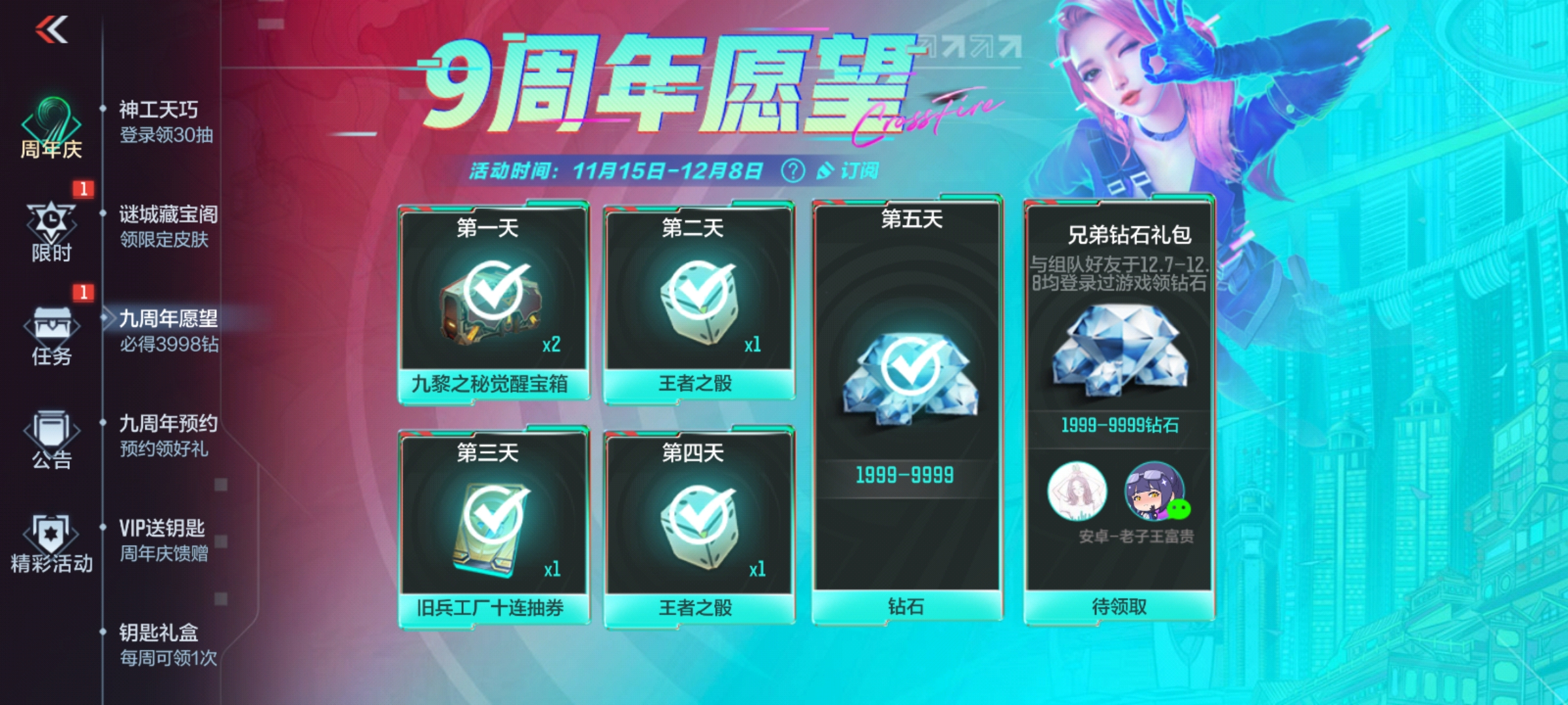 周年庆愿望可以参与两次抽1999-9999钻石,第二次即将在12月7日开启,小伙伴们只需要与组队好友在指定日期登录游戏,即可参与抽钻石活动,两次累计最低可领取3998钻石,真的很给力。