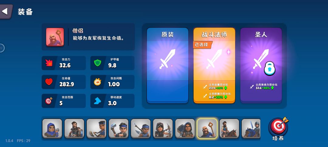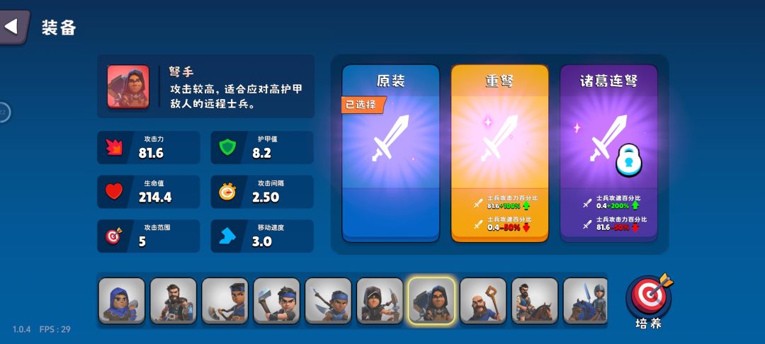 剑士,弓箭手,战锤兵、战斧兵已经解锁对应武器科技,在升级板块并没有体现。
