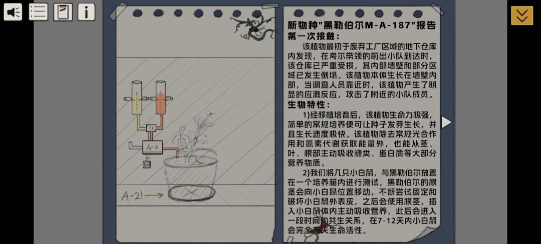 点击桌上左侧文件,获得文件“新物种“黑勒伯尔M-A-187”报告”,使用营养液LQ-S1-C和HF-S4可完成前期快速生长,该植物花瓣有苯胺酸化合物都效果。