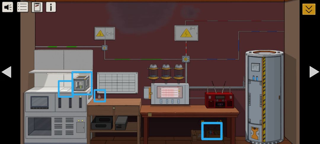时钟调到4:00,放入“机器零件(损坏)”,关上时钟,调到2:00取出,获得“机器零件(正常)”,放入B-3电箱。切换场景二,继续。如图所示,修改线路,启动程序。