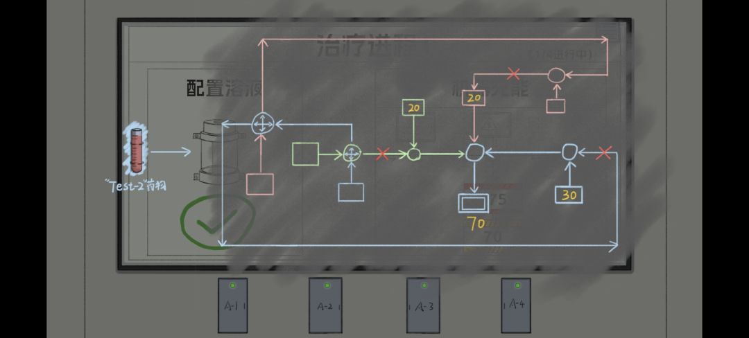 点击设备上密封柜旁文件,获得文件“治疗记录02”,使用植物M-A-187幼芽和植物M-A-187枯根,放入合成仪器,60的温度下使用混合模式,合成新药物Test-2。