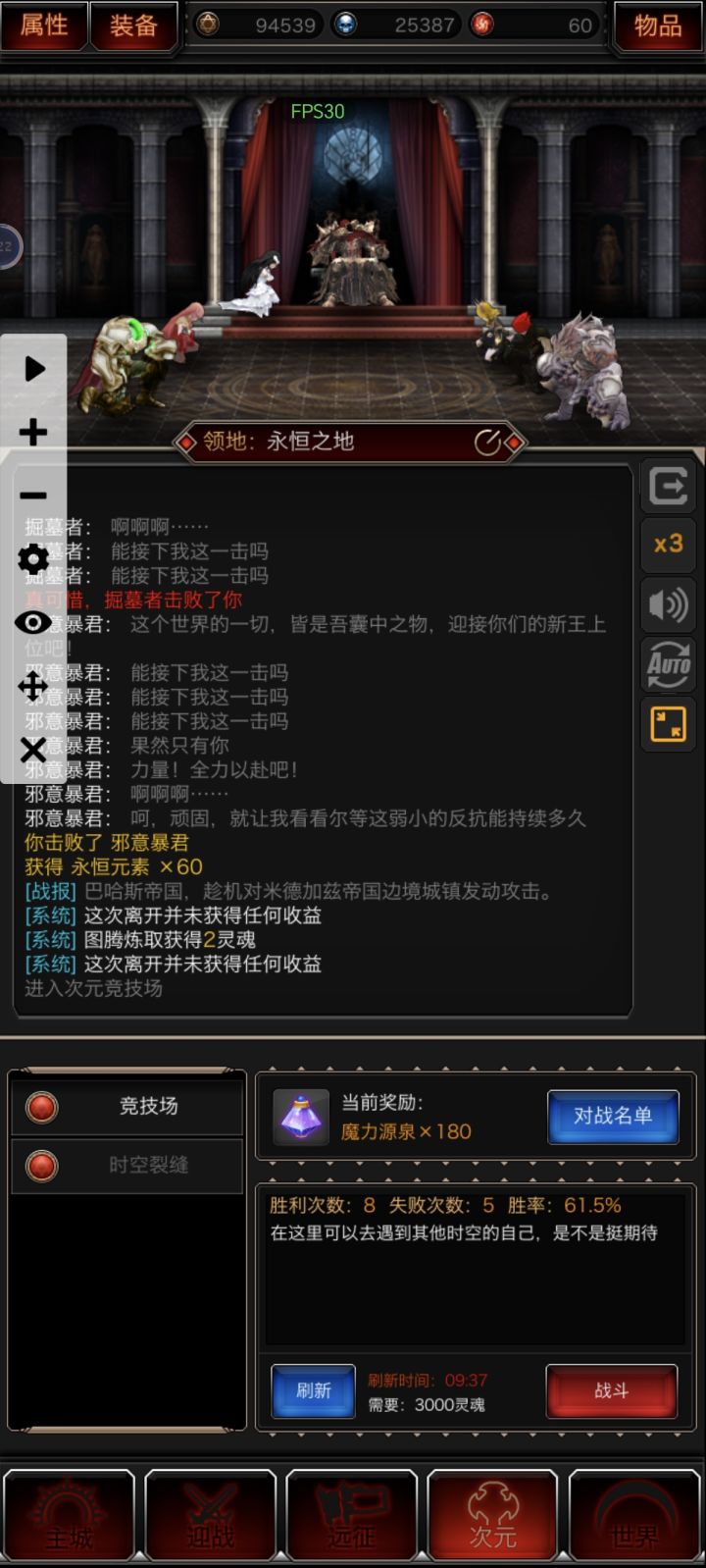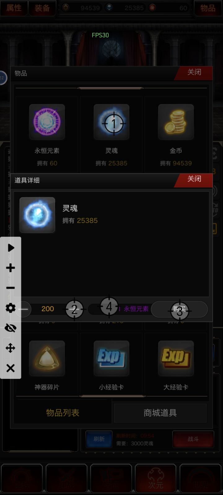 进游戏先在物品商城物品把新手礼包领了,别的都不重要,拿到200永恒就行。这可能算个小bug,购买灵魂100个和200个都消耗1永恒,用连点器换40000灵魂,就到次元的竞技场去。次元竞技场就是个随机剪刀石头布的游戏,消耗灵魂,看广告刷新奖品,前期以永恒为主。卡bug提高了一倍的永恒换灵魂,比如1000灵魂入场,回报40永恒就是8000灵魂,八倍回报。记得确保当前灵魂够连输四五次,不然运气不好连输几次就赌不起了