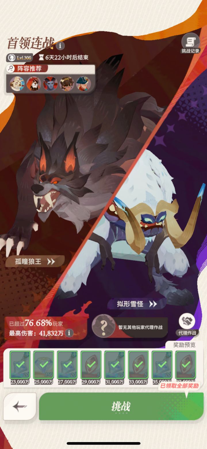 狼王阵容:骨王+科林+奶爸+跳跳+凤凰,这套阵容硬凑的伤害还可以,不过狼王的伤害大家随便打,雪怪一套就差不多了,这里只是补一下不够的伤害值,回响用赋翼术!
