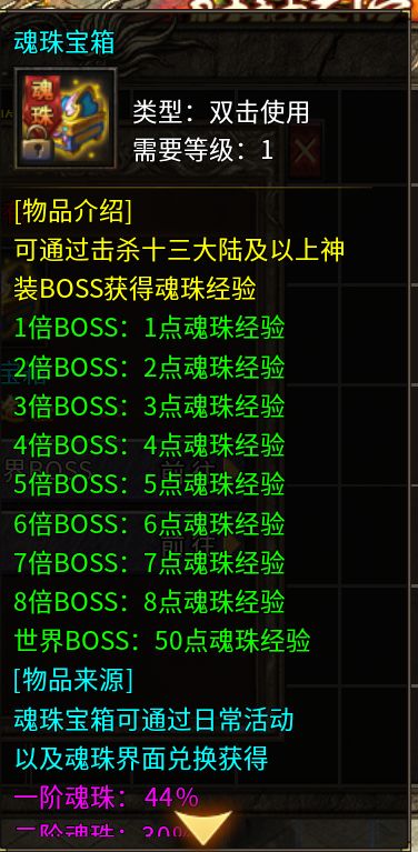 1、累计魂珠经验开启魂珠宝箱可随机获得任意阶数魂珠,击杀第十三大陆及以上神装以及世界BOSS可获得魂珠经验!