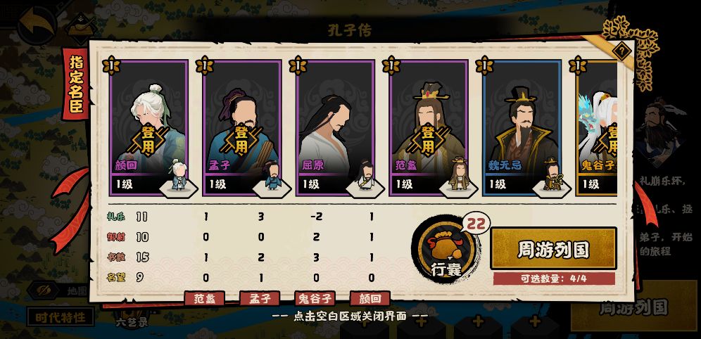 在孔子传中带入不同名臣时,除了现有的额外属性外,还会增加一些额外的物品。比如肉脯、钱币、经注、古籍、天书等,补充初始的资源。