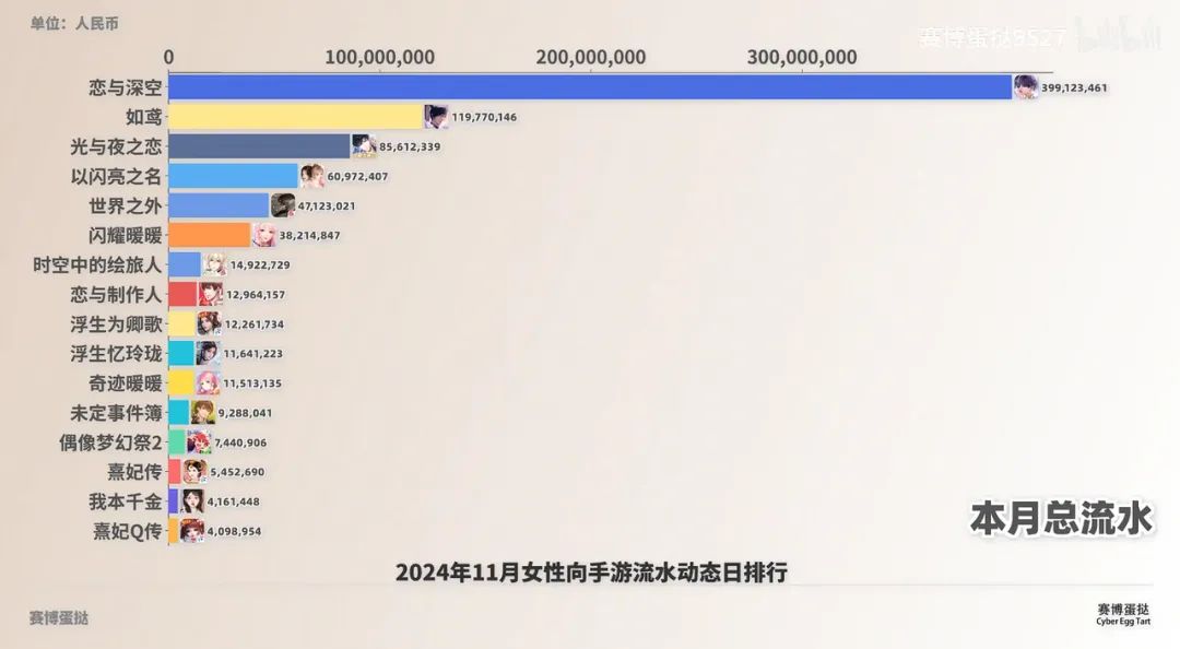 而且女性向游戏的竞争本身正在白热化。根据B站Up主“赛博蛋挞”的统计,今年11月,国产女性向手游收入过亿的有两款,超千万级的有11款。