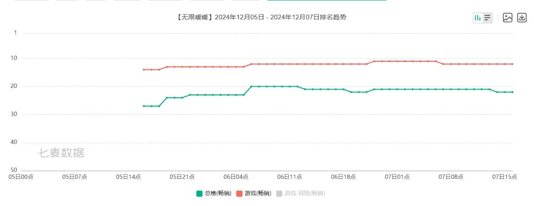 七麦数据的统计显示,《无限暖暖》开服至今,其在App Store畅销游戏榜排名一直在前10名开外徘徊。