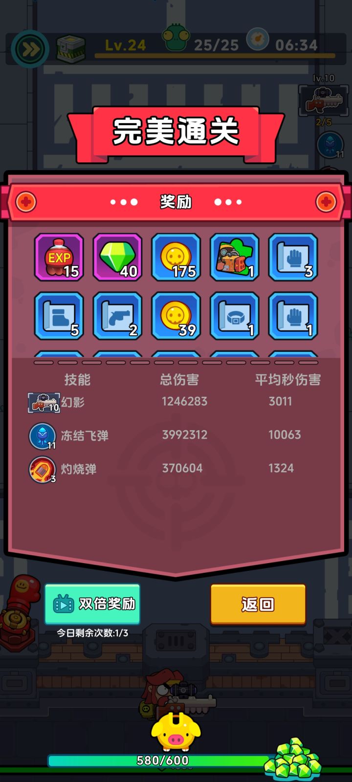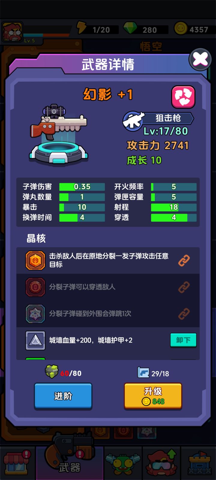 武器对应不同属性和技能,我是比较看好狙击枪之把的分裂技能,分裂技能的说明就是击中敌人后分裂一道可以攻击随机目标的子弹,基本是锁敌的,可以完美打出伤害。(上面图片有第17关的伤害数据)配上冰冻飞弹自己自带的分裂效果基本可以做到全屏杀敌,我是一口气打到了18关然后没体力了(没看广告复活体力,期间有掉线一次,浪费了5.体力)可以看数据这个伤害还是很可观的,打到后面,一关也就花个六七分钟的样子。