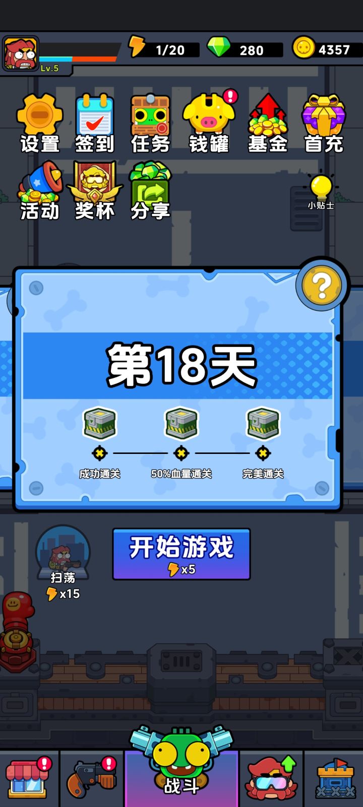 总体上来说也就是刚开始20次广告用来换高阶武器是比较重要的,其余30次你可以看着分配,因为我也是第一次玩,然后进去广告次数也浪费的比较多,用来搞关卡双倍奖励(4次)和首充好礼又用了2次,还有个猪猪钱罐是每关累积钻石奖励到600之后可以看10次广告开箱。(20+12+4+2+10=48)