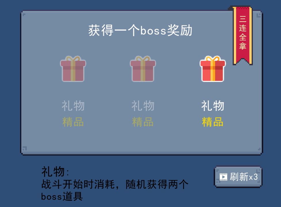 由于1.20只能在前六十关获得boss道具,所以不得不教大家一些歪门邪道了,不,不算的,那只是特性而已。由于礼物可以在离开篝火后随机开出两个boss道具,也就是在第十关获得一个礼物会在第十一关开始的时候开盒子。那样就有操作空间了,如果在第十一关开出的道具不满意,我们返回主页再继续游戏,就能重新开礼物,这样就能刷我们想要的道具了,由于礼物的特性,我们可以刷已经有的boss道具,比如我们可以用这个方法刷5个悬赏令