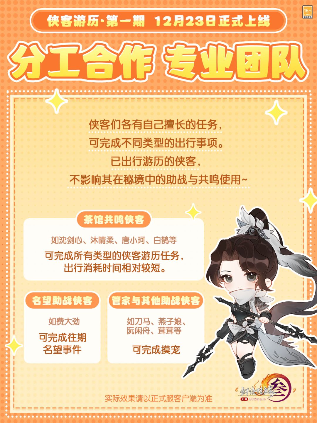 侠伴江湖,得尽其用!各怀绝技擅其所能的侠客们已经做好了准备,将为侠士完成一部分琐碎和固定的重复任务。侠士还可以根据他们的类型委派不同的游历任务,在这期间,他们依然可以在秘境中发挥重要作用,通过助战和共鸣并肩战斗哦!