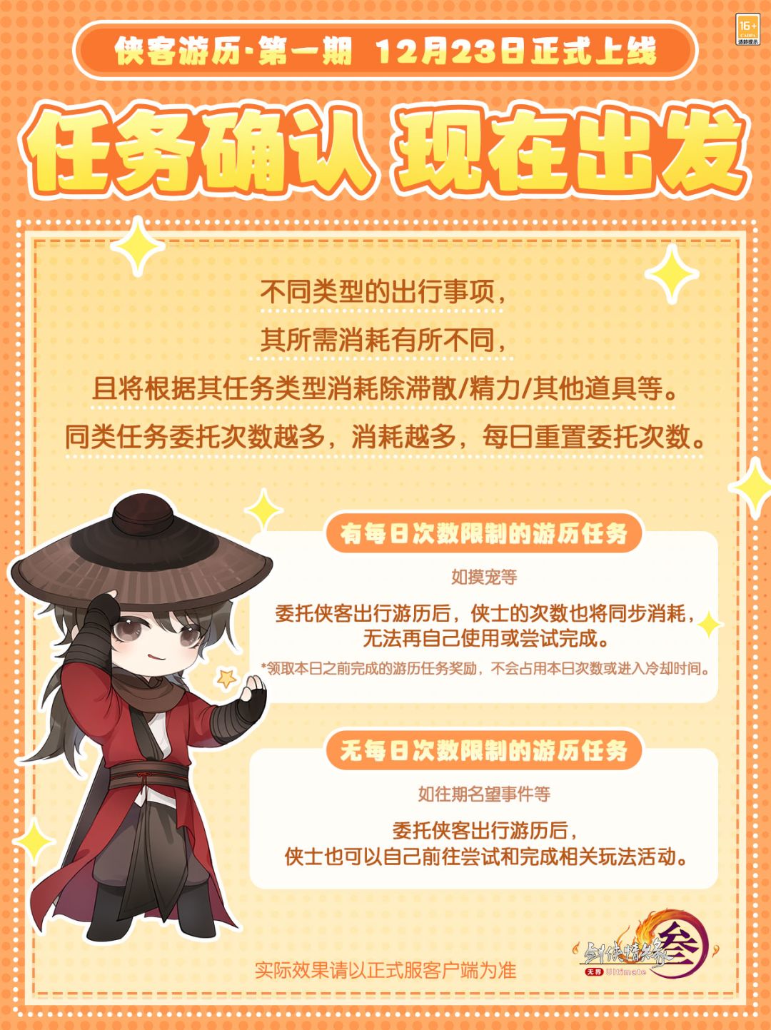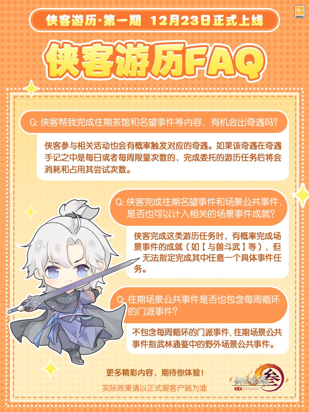 侠客完成游历任务委托,除了会带回该玩法原本的奖励以外,还有概率触发相关的奇遇或完成对应的成就。每次游历的消耗将根据任务的耗时与次数有所不同,成就和奇遇相关问答今日奉上!更多相关精彩内容,待侠士们亲自体验和发掘!