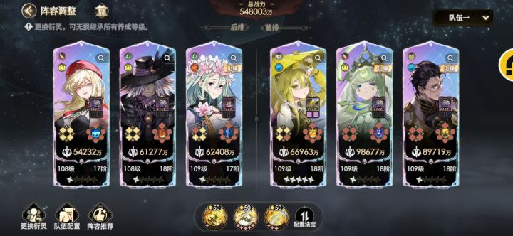 思路:核心靠法宝和多罗多回合叠间接伤害打输出,李靖保人,后排乌禅和持樱互相保护保持人数,便于释放法宝,基本都要15回合左右才能结束战斗 个人实测下来怕高战的高爆发队伍