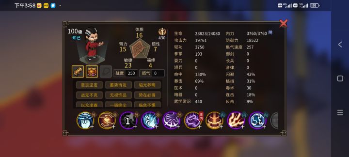 十八个小时,看两万加的防御,其实我还能堆得更高,但是没必要了。最终BOSS秦桧也就19761的攻击力,我比他更像BOSS。不愧是亲儿子剑法,太强了。