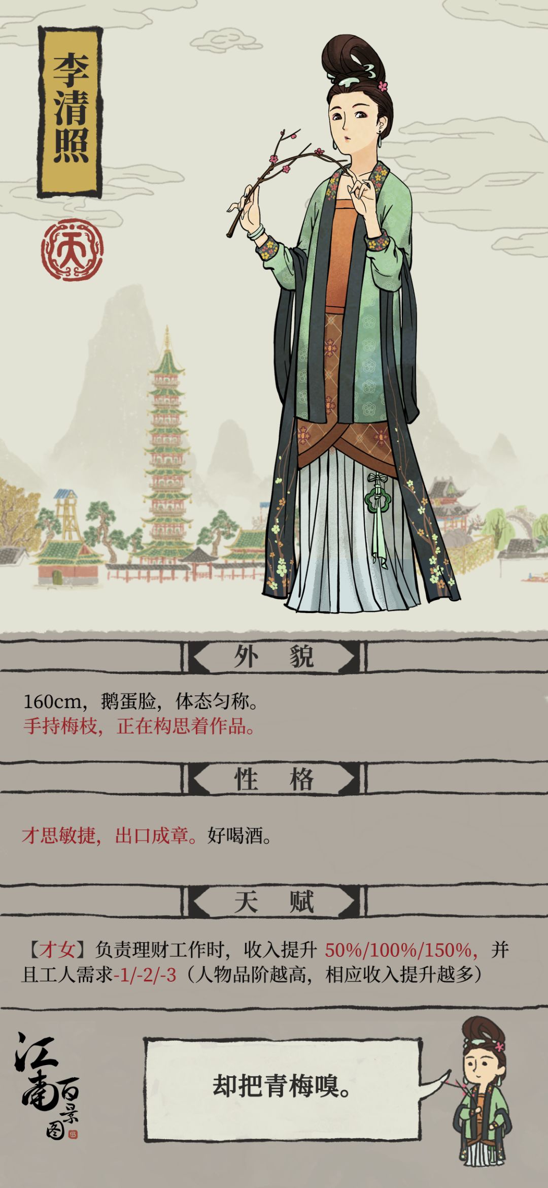 在《江南百景图》中,李清照是一众词人间唯一的红颜,也是唯一被奉为「酒仙」的人。