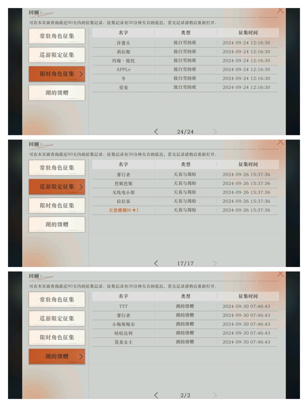 1.1退坑,2.2回坑(五六页成就可以证明在成就推出之后,到24年9月24号之前是没有登录过的)(第七页的抽卡记录也可以证明)