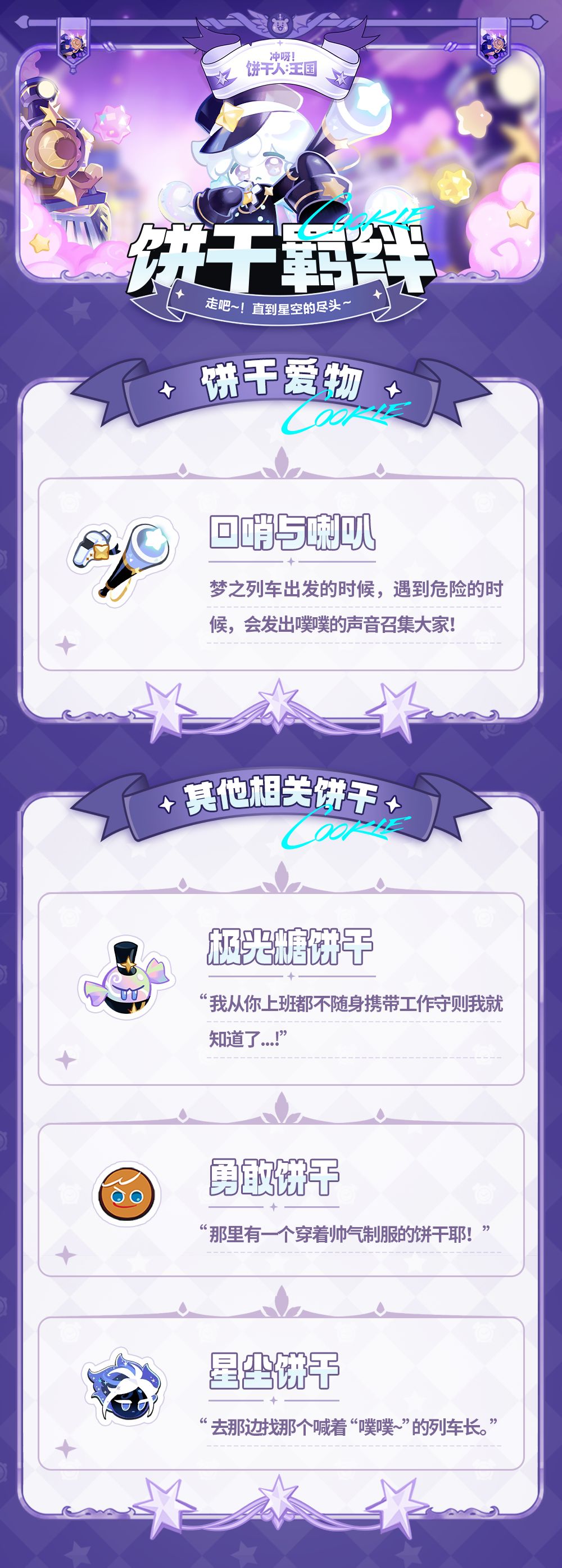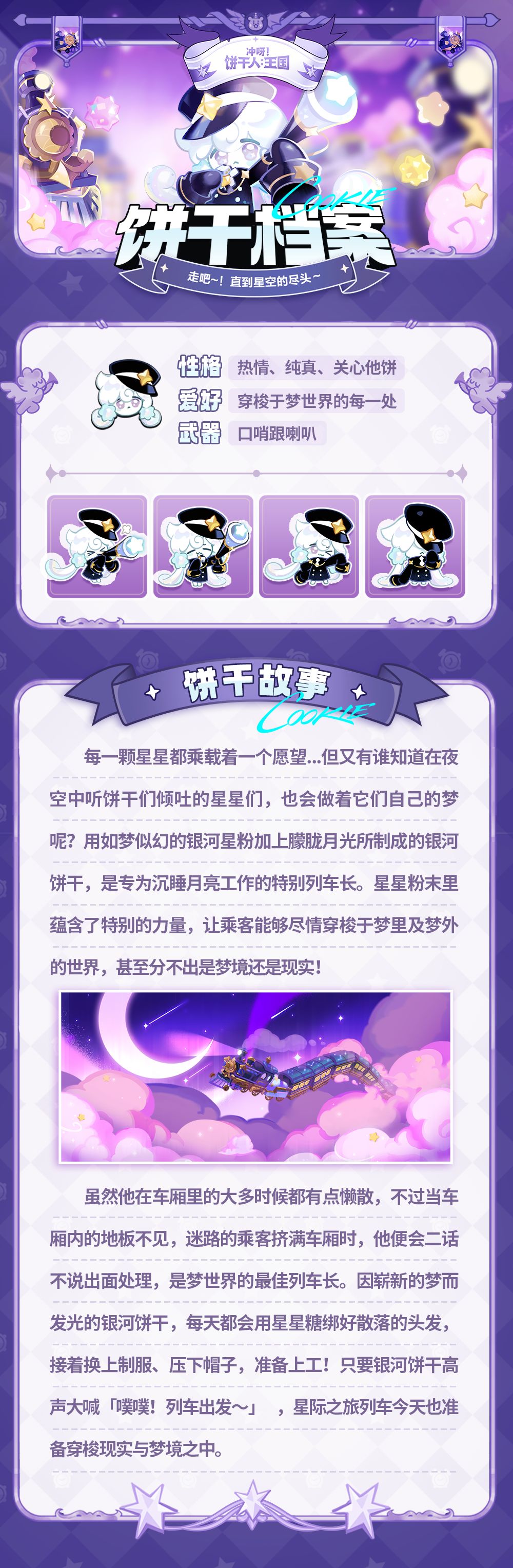 每一颗星星都乘载着一个愿望...但又有谁知道在夜空中听饼干们倾吐的星星们,也会做着它们自己的梦呢?用如梦似幻的银河星粉加上朦胧月光所制成的银河饼干,是专为沉睡月亮工作的特别列车长。因崭新的梦而发光的银河饼干,每天都会用星星糖绑好散落的头发,接着换上制服、压下帽子,准备上工!只要银河饼干高声大喊「噗噗!列车出发~」,星际之旅列车今天也准备穿梭现实与梦境之中。