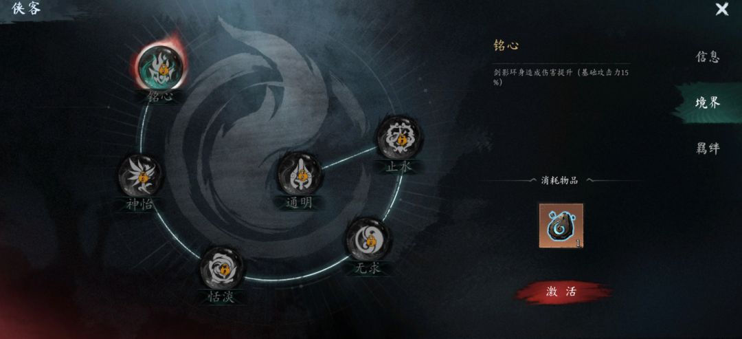 侠客境界:重复获得侠客后获得提升境界道具。需要手动激活该侠客高境界效果