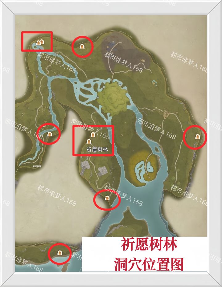图一:祈愿树林 - 洞穴位置分布图。