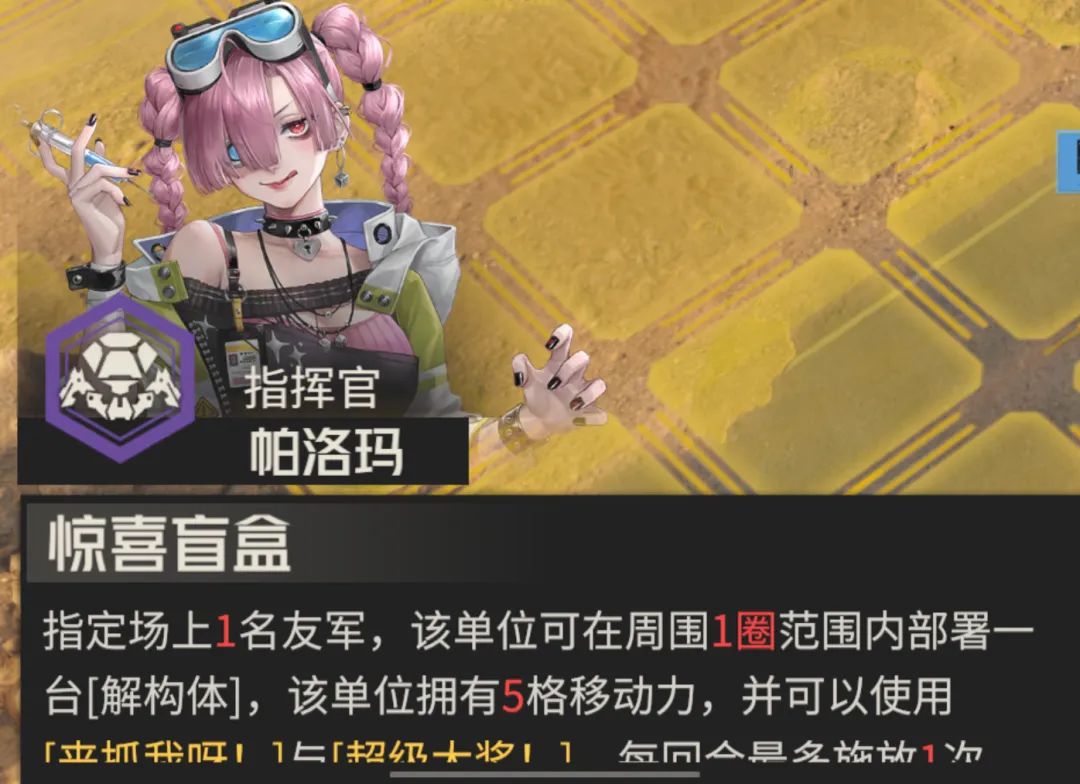 然后在限定副本中也有指挥官技能的设定,而帕洛玛的技能【惊喜盲盒】所召唤的这个解构体配合帕洛玛的架起效果简直可谓是天作之合,完美的解决了帕洛玛架起后不能攻击到其它方向的弊端,同时还有担心掉buff的问题也能通过这个解构体来解决,所以如果我们大胆的假设官方在上帕洛玛的时候,能把这个解构体的相关能力涉及到她的一个技能中,那么帕洛玛的强度应该就是保底T0.5起了。