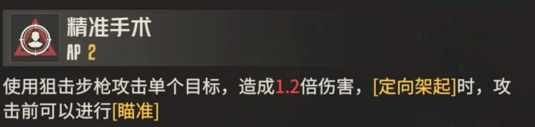 - 接着的【精准手术】技能基础是2AP换1.2倍的伤害,看似平平无奇,不过在架起后却能进行瞄准,大大的提升了这个技能的泛用性