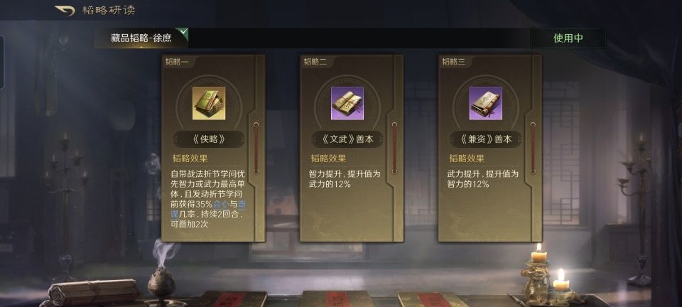 田丰战法:荐计阻敌+运筹帷幄+指点乾坤。韬略库:励军善本+权略(专属)+劫智善本。重骑兵特性坚韧,专精点亮骁勇善战。
