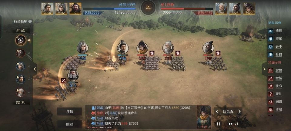 徐庶战法:折节学问+文武双全+锐不可当。韬略库:侠略(专属)+文武善本+兼姿善本。轻骑兵特性疾驰,专精点亮骁勇善战。在金书权略和骁勇善战专精的加持下,田丰的荐计阻敌发动率可以达到75%。对面忠义骑组合里,统率值最低的是马超,刚好给他来个全方位打压。本方这边统率值最高的是左慈,也吃到了田丰荐计效果的大幅增益。