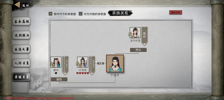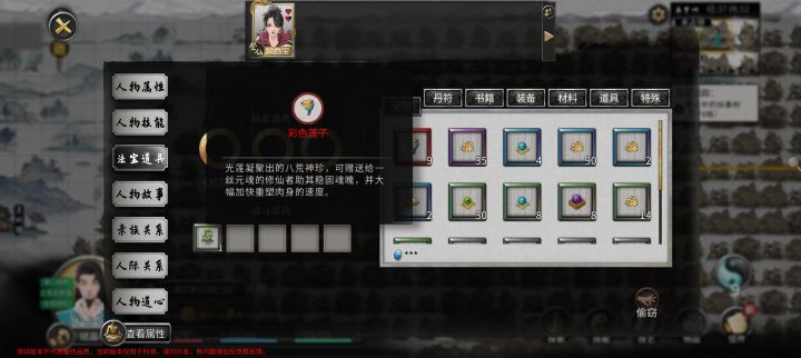 7,每回合用双鱼点一下师傅,在师傅进入高阶区域的时候,可以用莲子舔城里的人,尽量送有情种的异性和义气的同性,送2-3个就可以2星多半个心,就能结义和道侣(如果狗一点可以偷回来,被发现几率超高,因为人家境界太高了,sl还是可以偷的)。你就拥有了一个资源提取点和保护伞,养成规模以后,你每次过月都会有1-2个兄弟和道侣找你,只要他们在身边,你的仇人和冤家很难动你。