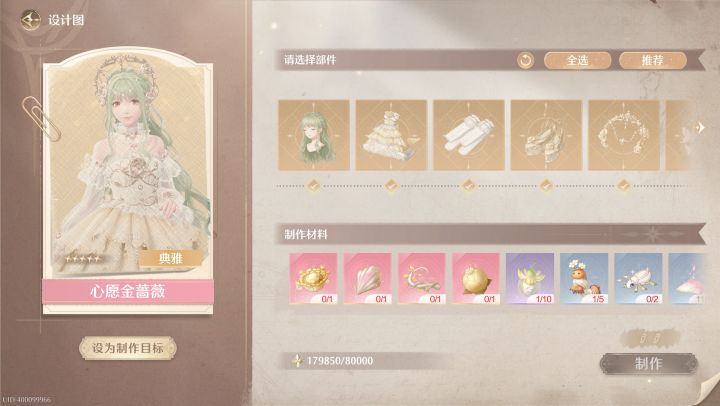推荐可选升级套装如下,强烈不建议升级主线送的能力套装(心愿金蔷薇本身是典雅属性的五星套装,如果已经制作了一些部件,也可以升级)