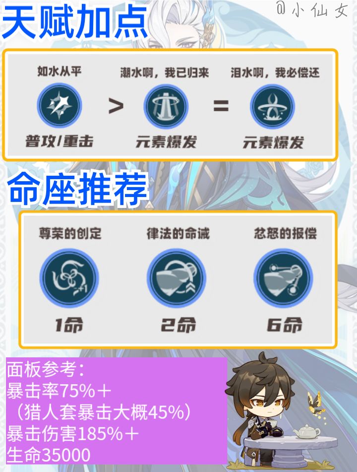 他的伤害来源于蓄力重击,天赋和命座都是为了这门大炮服务。除了触发天赋的启动阶段,不需要考虑复杂的元素反应和操作,只要按住左键就能打出满额伤害。
