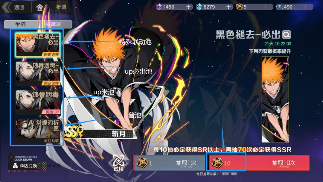 up必出池:70抽保底出up刃,每满一百抽给你一把随机普通ssr刃
