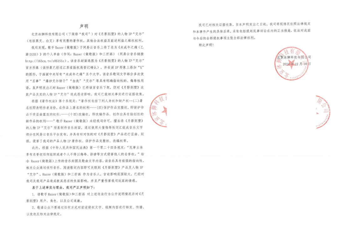 2.我司就侵权歌曲事件特此声明,敬告公众不要再扩散传播侵权相关内容。