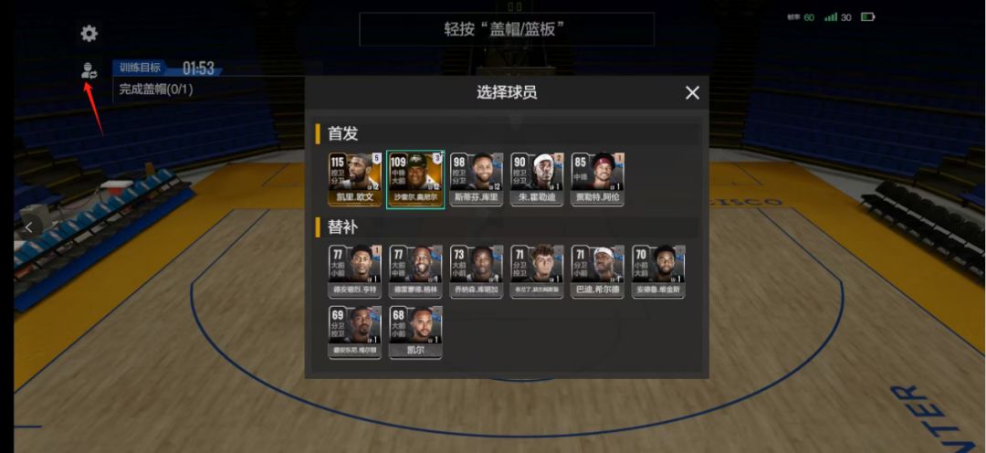 这其中还是会有些训练项目,默认球员难以完成,左上角人物图标可以切换球员哦,例如盖帽训练,完不成就赶紧换人,中锋大前高个子球员(如戴维斯、奥尼尔、祖巴茨等),都是可以很轻松完成的。