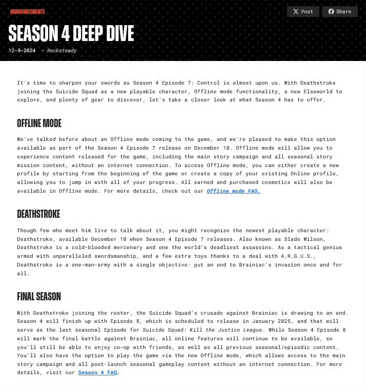 12/9号,开发商 Rocksteady 在公告中宣布,《自杀小队:消灭正义联盟》将停止更新❗❗❗