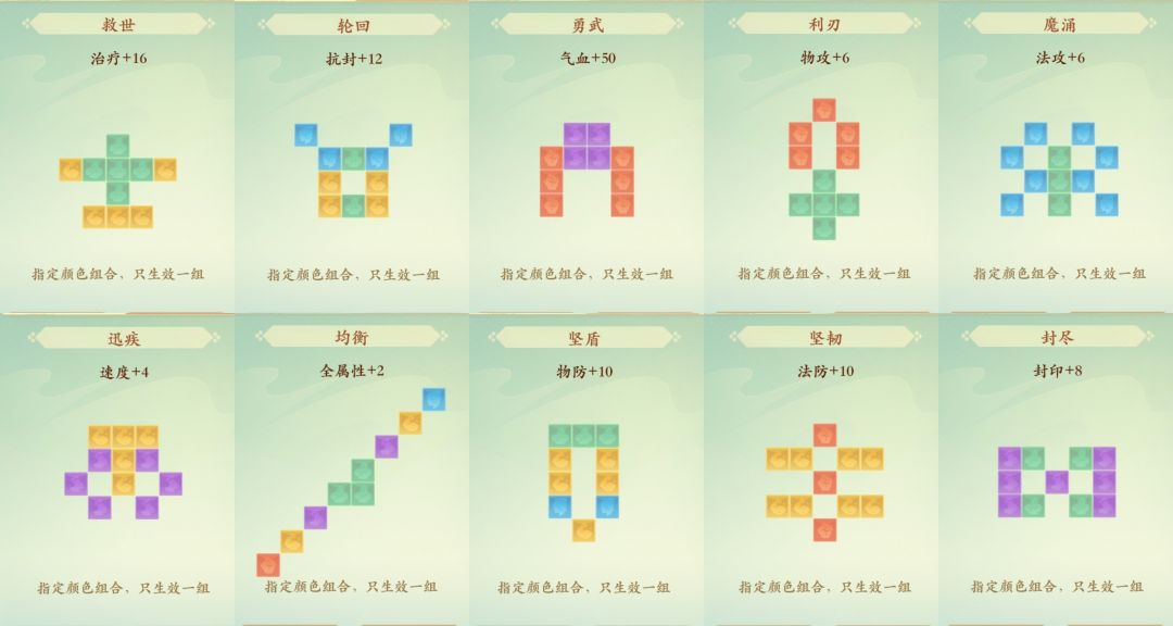 【悟性图案】要求会更高,需要的色块更多,基本是10个11个起拼,且色块颜色也有固定要求,但是但来的属性也更加强力