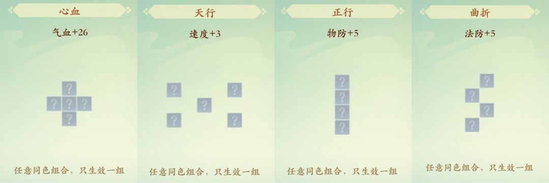 【根基图案】有4种,不限制方块颜色,但是需要颜色相同的色块,4个为1组,是比较基础的色块搭配,不够10个的时候可以先组3个根基图案来过渡,等可以组悟性图案的时候也可以当做边角料来补充属性
