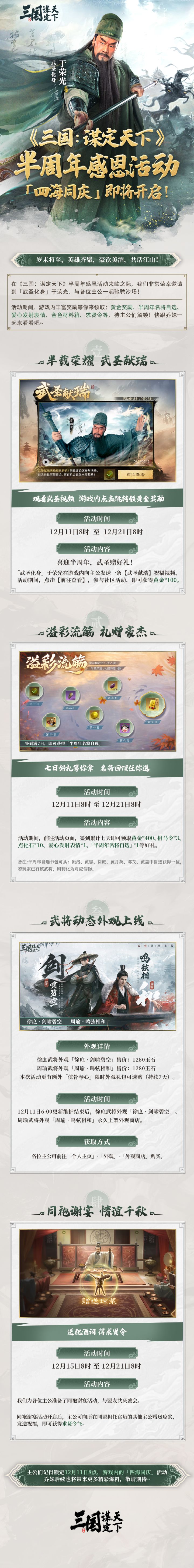 为答谢诸位主公半年来的鼎力支持,我们精心筹备了本次半周年感恩活动「四海同庆」。12月11日早上8点活动将准时拉开帷幕!