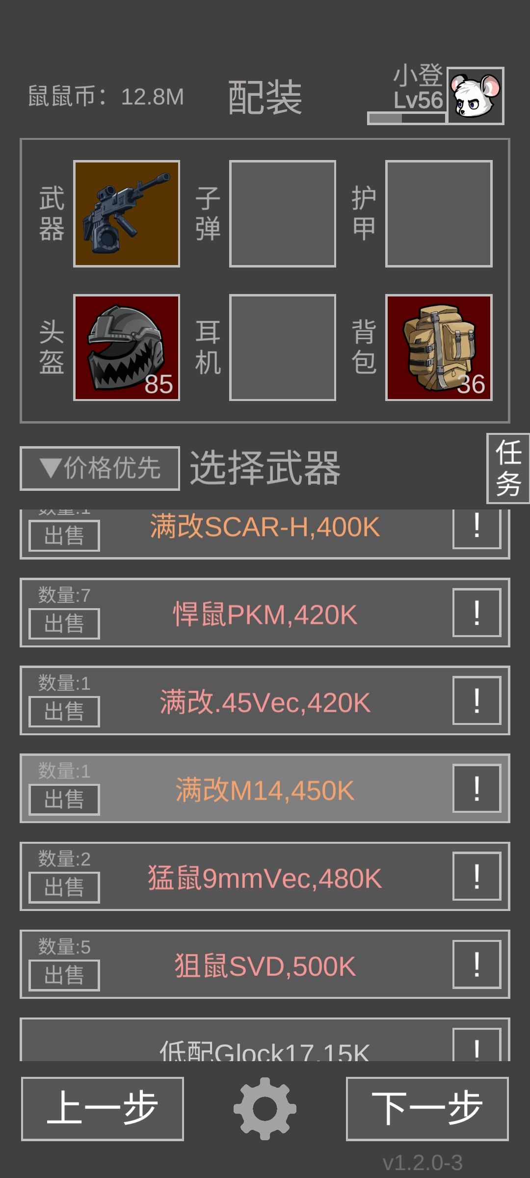 重点说说狙鼠,单人打法其实装备是和打悍鼠猛鼠一样满改mk就行,子弹方面求稳的话就带五级弹毕竟狙鼠和护卫也就五级甲,而六级弹后座会大一点。至于m4,scar,修脚枪之流通通不推荐。最重要的是生化超鼠套装,可以有效减少后座也就是提升命中率。打法也是丢雷瞄躯干打,不同的是要自定义让打空率压到4%左右大概就这样式