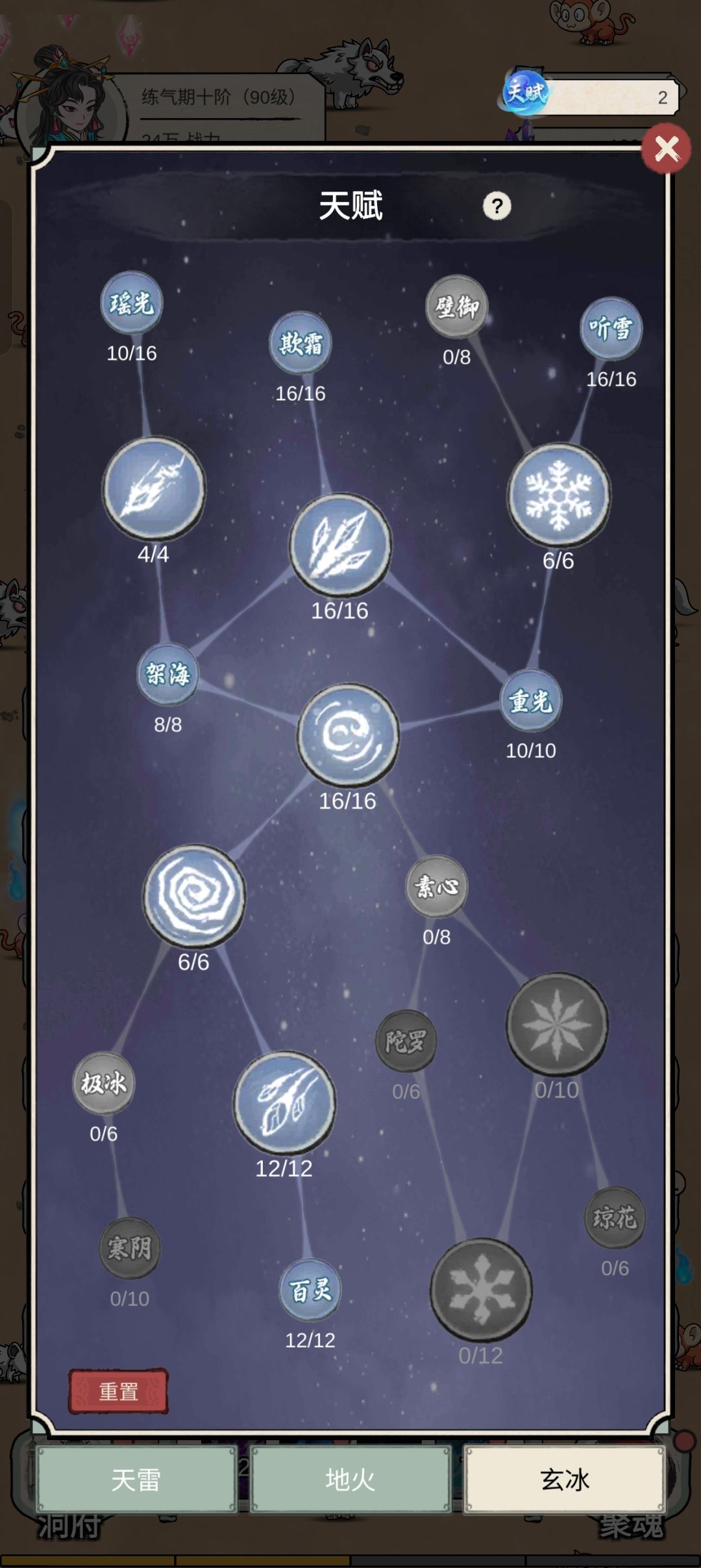 九天雷动20%-50%秒杀,最强清群,给火灵兽提供输出;冰魄寒天打头目很强,配合天赋的刷新技能可以很快的秒头目,风霜雪舞叠层刷盾,剩下的冰系里反而初始的冰不用升级也能很快叠层;天赋里防御都可以不要,特别是加冰盾时间的天赋不要点,如果图里的冰系点满了直接换雷系加爆伤和输出
