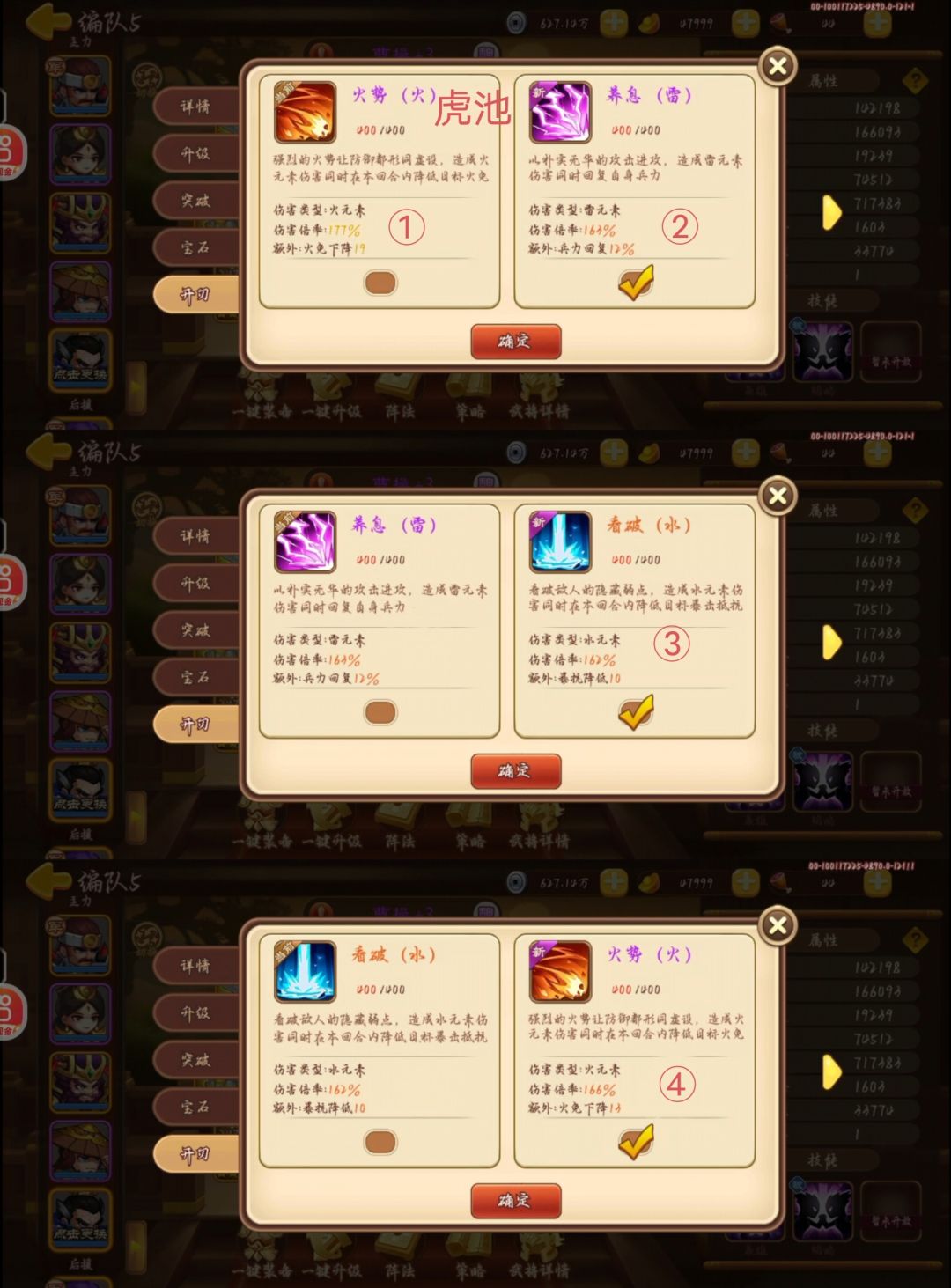 经过上一步的筛选我们能已经获得了封穴武器,同样用观星之法看虎池龙池牌(技能),主要关注效果值,不看技能。看看有没有接近25或100%的,记住顺序(假定虎池⑤号是24的效果值,180%倍率,技能为看破)。前四张牌应好好利用(每一张都来之不易),看看有没有黄值(虎池一般为红值)的倍率(给其他武器刷倍率须将其技能锁定),或者好用的技能(已开刃的武器不需锁定),将其分配给其他武器。开第五张牌(第五次开虎纹石)前需要锁定技能,开了之后原本的卡牌(看破25效果值,180%倍率),变成了封穴(100%效果值,180%倍率)。要注意的是小数字和百分数之间转化存在不确定性,例如:89%的效果值可能变成21的效果值。25也不一定等于100%,99%,98%都有可能。