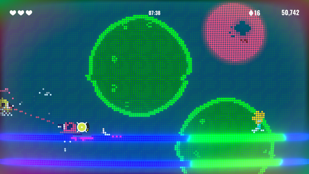 在Game Jam阶段,他们的目标是做出一款2分钟一局的街机体验的游戏。玩家只有一条命,可以射击攻击敌人,同时利用后坐力移动,被敌人碰到就游戏结束。