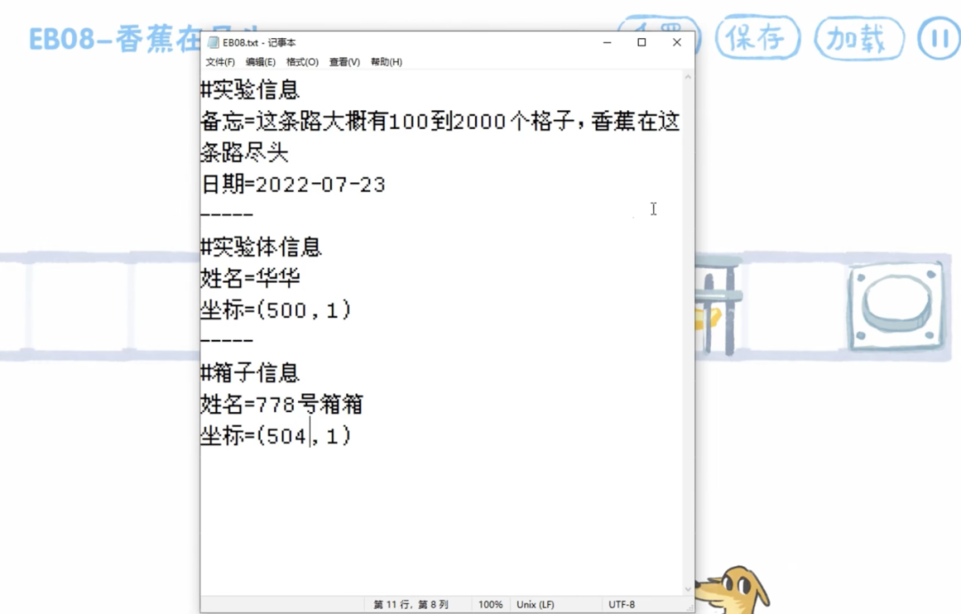 这款游戏的玩法是利用记事本来推箱子,玩家时不时需要跳出游戏,在记事本中做一些解谜。比如下图就是玩家需要结合游戏内的画面,推测并修改箱子的坐标,进而解开机关。