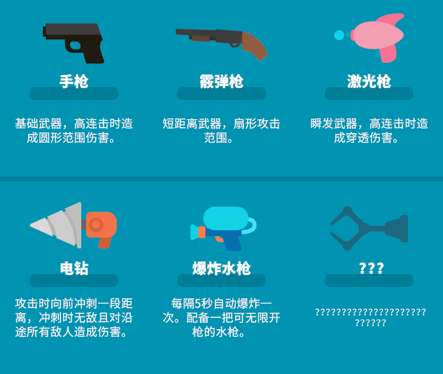 每把武器都要在连击机制的基础上,设计出独特的玩法和策略。手枪高连击状态会有圆形范围伤害,激光枪在连击状态下则造成穿透伤害。