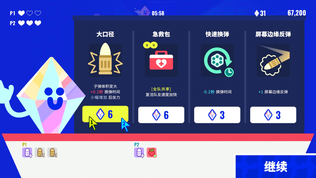商店道具提供了四类主要升级方向:子弹、重新装填、连击和通用升级。此外还有一些通用组合,如防御的build,或者拾取类build。