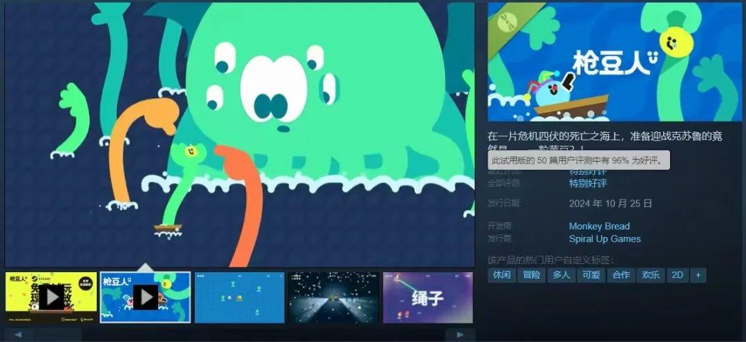 《枪豆人》是一款依靠后坐力移动的快节奏射击游戏,玩家操纵拿着枪的黄豆人在大海中漫游,攻击克苏鲁的手掌来确保自身的安全。它支持1~4人联机游玩,是个热热闹闹的合家欢游戏。
