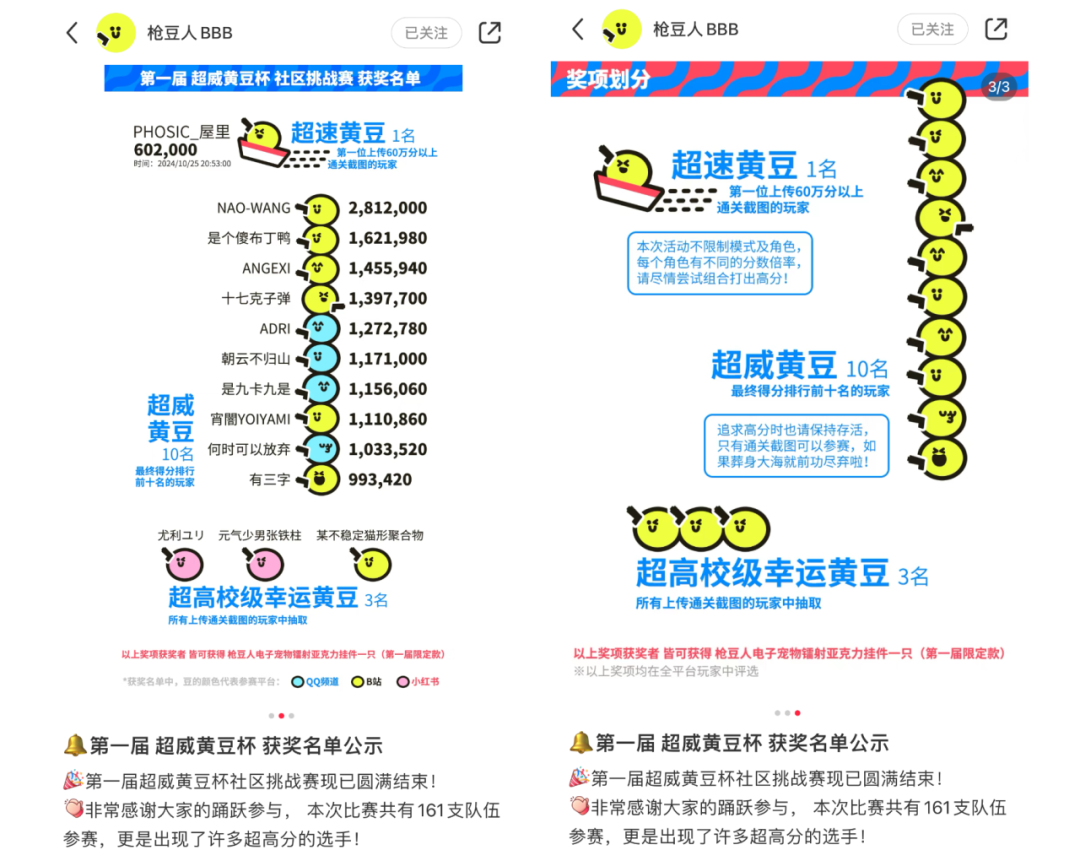 最近他们举办了「超威黄豆杯」,这是个鼓励玩家们打出高分的社区挑战赛,在B站和QQ频道都有数百人参加。