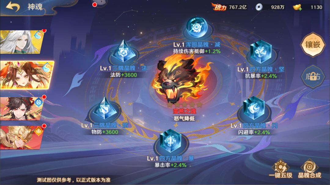 小提示:当神将身上的6个晶魄同时达到特定等级后会激活共鸣属性,此时神魂可以提供属性加成。
