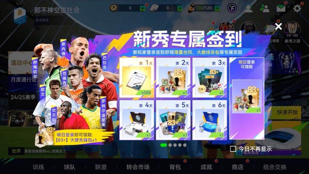 1、新玩家完成新手训练即可从C·罗纳尔多、梅西、姆巴佩、哈兰德任意 1 位邀请加入球队。