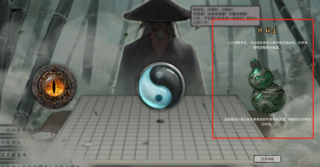 1、怎么选炼妖壶:炼妖壶是游戏初始三神器之一,具有炼化妖兽的能力。玩家可以在初始界面直接选择炼妖壶作为自己的神器。